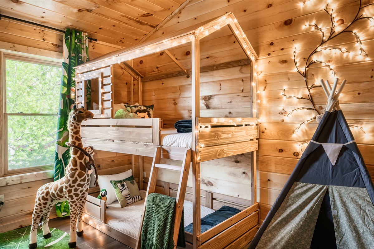 - Treehouse themed kids bunk room with 85" TV, play tent and star lights