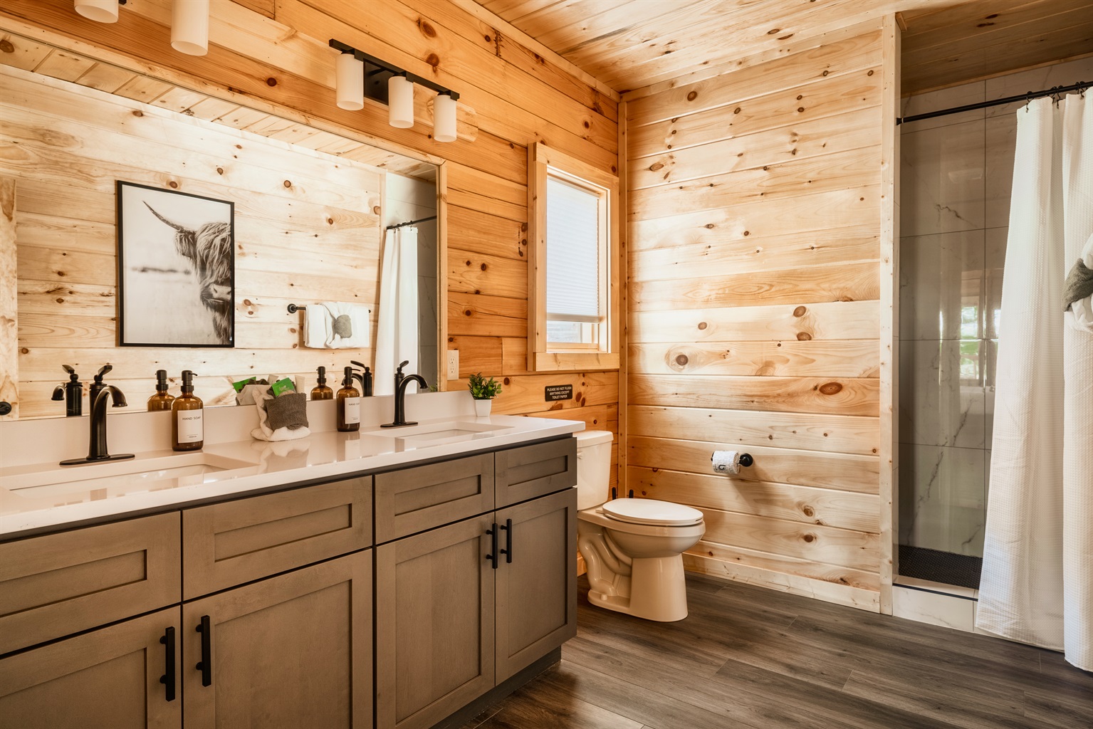 We provide shampoo, conditioner and body wash in dispensers in all showers. Toilet paper, hand soap and dish soap are provided. Trash bags for the kitchen, bathrooms and outdoor bear bins are provided. Paper towels, dishwasher detergent and laundry detergent are also provided. Depending on the length of your stay, you may need to purchase additional items if your initial supply runs out. Bathrooms have a hair dryer in the cabinet under the sink.